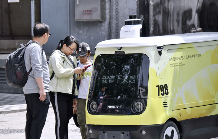 游人在北京798文化园区的一台智能无人售货车前购买饮品(2025年5月4日摄)。新华社记者 李欣 摄