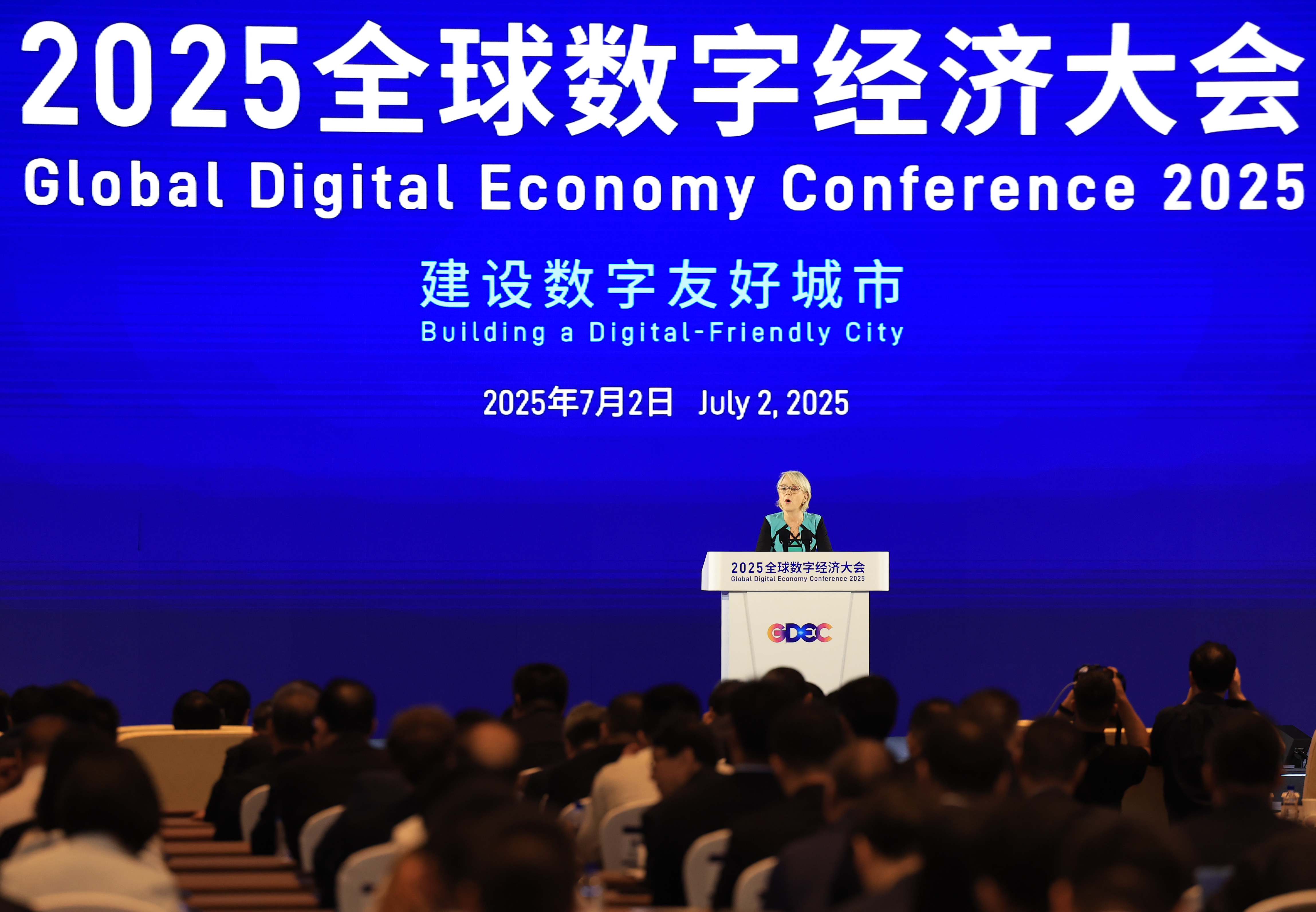 2025年7月2日,联合国开发计划署驻华代表白雅婷在2025全球数字经济大会开幕式上致辞。新华社记者 张晨霖 摄