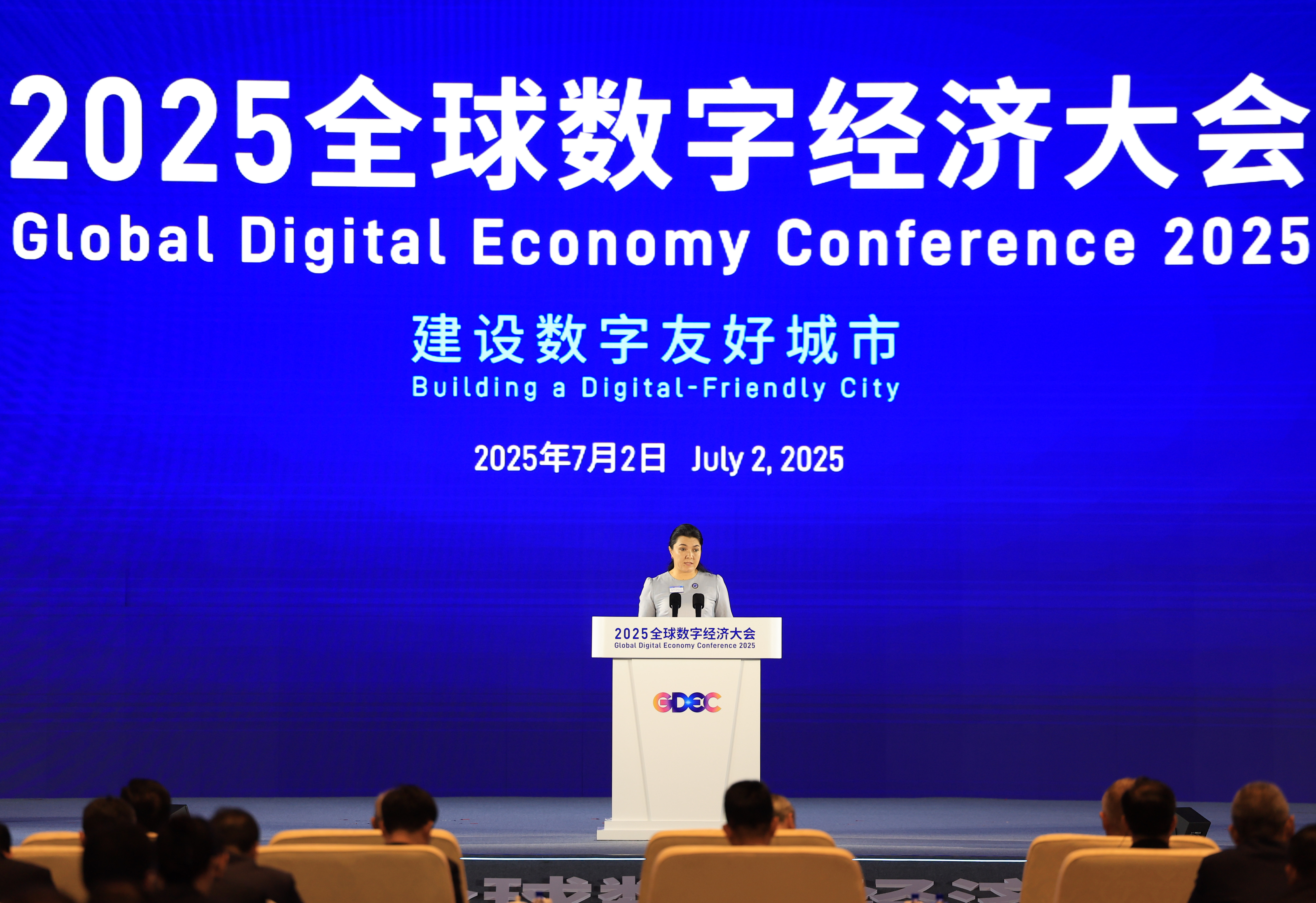 2025年7月2日,乌兹别克斯坦塔什干市副市长拉希莫娃·杜尔多娜·舒库鲁拉耶芙娜在2025全球数字经济大会开幕式上致辞。新华社记者 张晨霖 摄